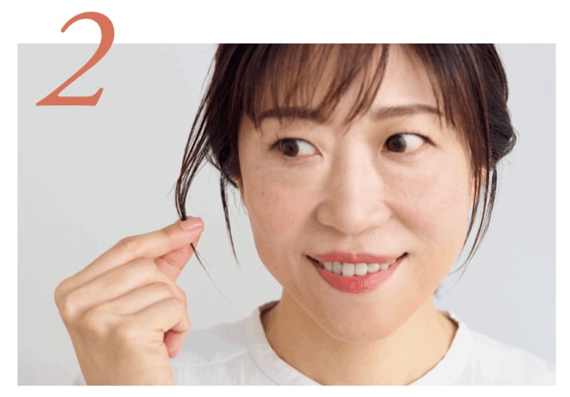 後ろの毛束をゴムで結ぶ。1で引き出した後れ毛にヘアバームをもみ込みながらなじませて束感を作る。