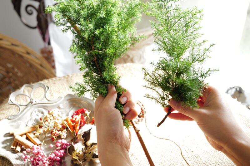 あれば、ワイヤーで作る方が、枝が固定されやすいので作りやすいかも。グリーンのワイヤーだとより目立ちづらいのでおすすめ(花材店で取り扱っている場合もあるそうです)。
