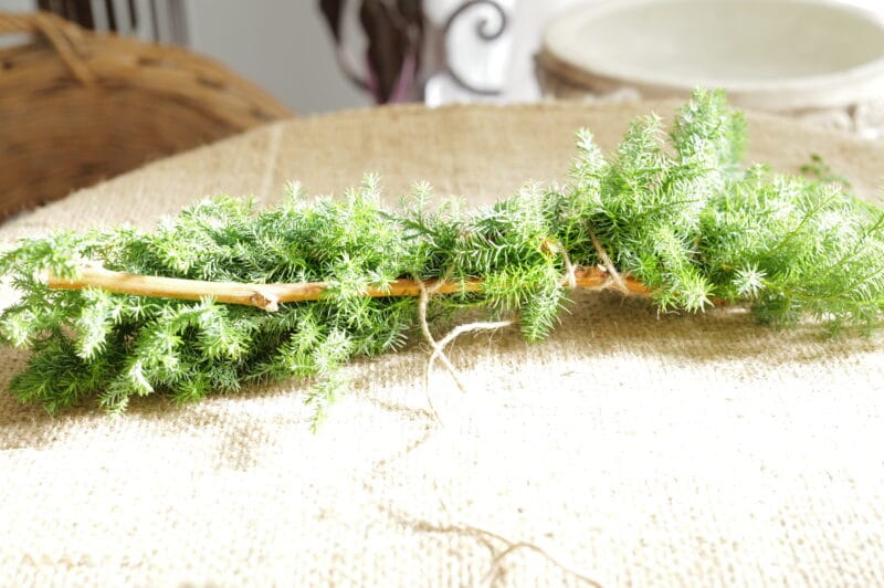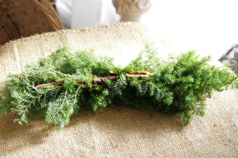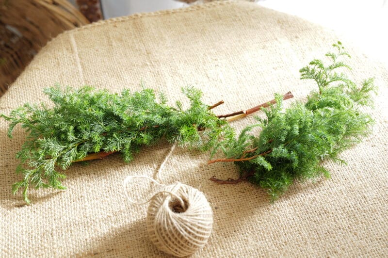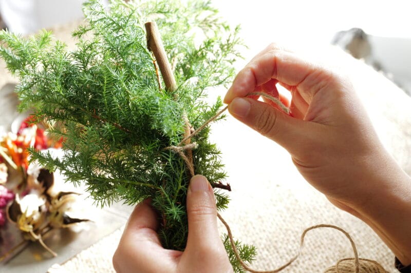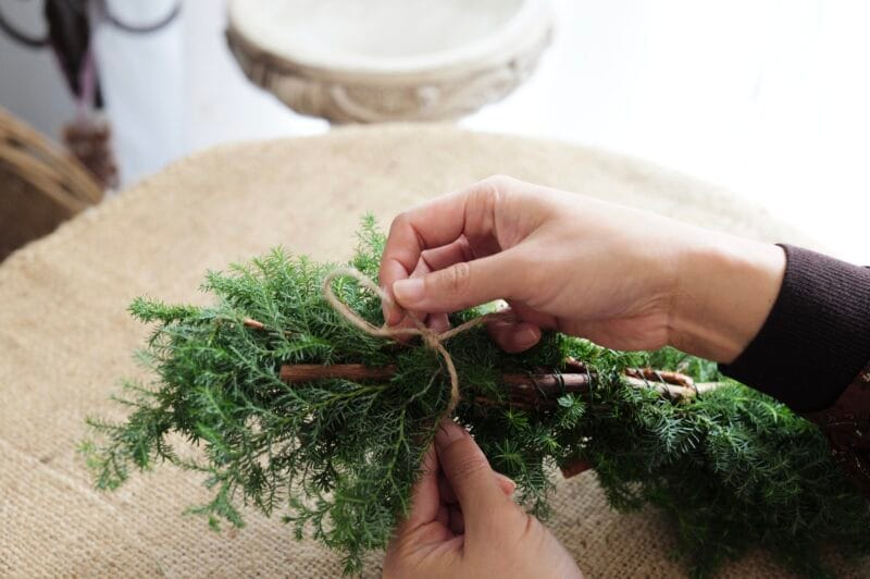 少し下にズラしてサツマスギの枝を重ね、麻紐を巻きつける。