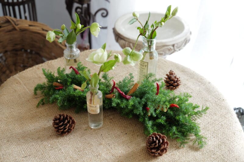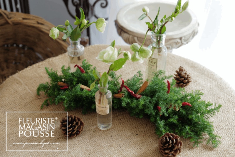 アンティークの小瓶にクリスマスローズを活けてプラスすれば、一気に華やぎます。ゲストを迎えてのホームパーティにもぴったり。