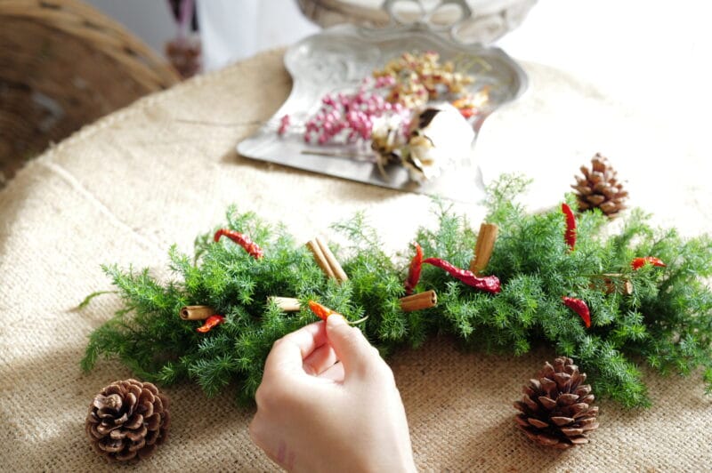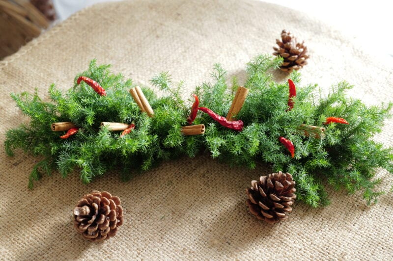 ・好みの飾り(木の実、シナモン、綿花、鷹の爪、松ぼっくり、リボンなど)