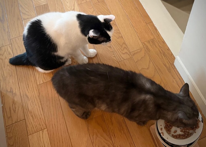 でも、このままでは「横取り=NG」のルールを一生覚えないのでは? という不安がよぎり、新入り・いっくんが加わったタイミングで思いきってケージをしまい、横並びスタイルに変えてみた。