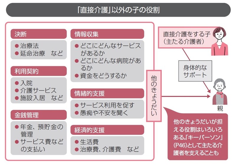 介護といえば、入浴、排せつ、食事の介助など身体的なサポートを思い浮かべがちです。手を出さないきょうだいは、そうしたことが不得手か、時間の確保が難しいのかもしれません。