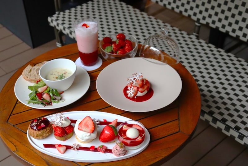 アフタヌーンティーのラインナップは、苺スイーツをメインに、苺を使ったサラダまで盛りだくさん!店内にはテラス席もあるので、天気が良い日は青空の下で楽しむなんてことも◎