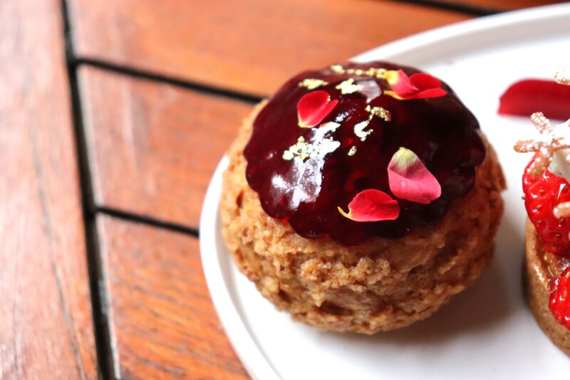 オーガニックシュガーで丁寧に炊き上げた濃厚なカスタードクリームが、ふんわりと焼いたシュー生地にたっぷり詰まっているので、最後までクリームを堪能することができます。仕上げには赤ワインゼリーのシートと華やかさを演出する花びらを。そしてなんと、クリームを詰め込んだ部分には苺が添えられており、表面からは見えない部分にも嬉しい仕掛けがありました…!