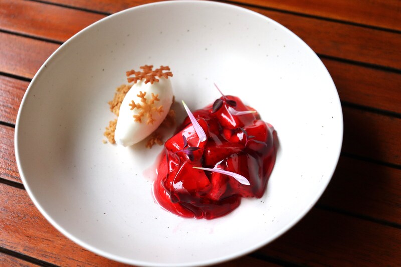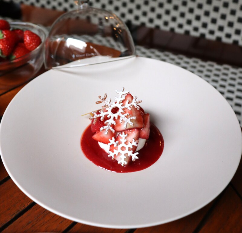 フロマージュブランとサワークリームに、軽やかなメレンゲ、苺とラズベリーのソースを重ねた一皿。あまりんとハイビスカスのゼリーシートが添えられており、そこに散りばめられた花びらが彩りをプラスしています。さっぱりな味わいのミルクソルベと、雪の結晶をかたどったチュイルが、冬ならではの繊細な世界観を感じさせてくれます。