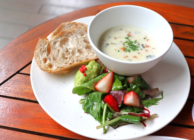 大ぶりにカットした色とりどりの具材を、貝の旨味と牛乳、クリームを使って仕上げられた、食べごたえ抜群のスープ。サラダには、苺と相性の良いフランボワーズドレッシングを合わせ、苺の甘味とビーツの彩りが華やかな印象を感じさせてくれます。備え付けのパンととても良く合う2品です。