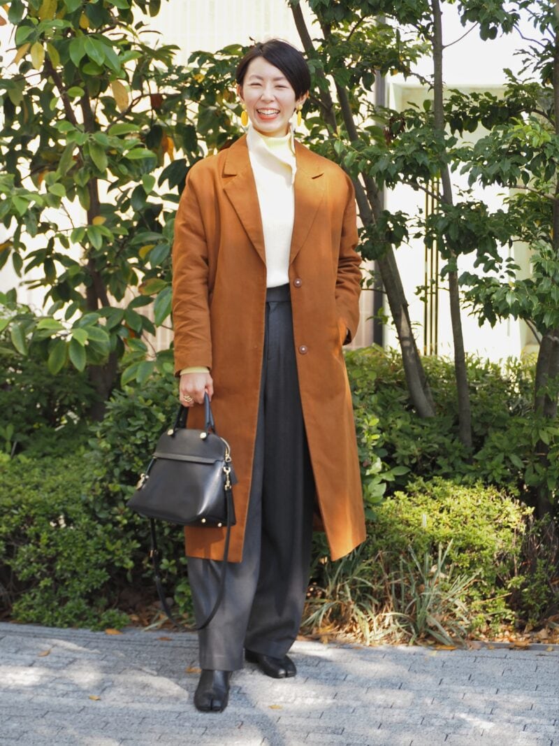 コーディネートの主役は、柔らかな冬の日差しに映える「ジャーナルスタンダード」のキャメルのトレンチコート。モノトーンでまとめたワンツーコーディネートをぐっと明るく華やかに仕上げています。パンツはワイドシルエットを合わせ、上品さとリラックス感をほどよく両立。