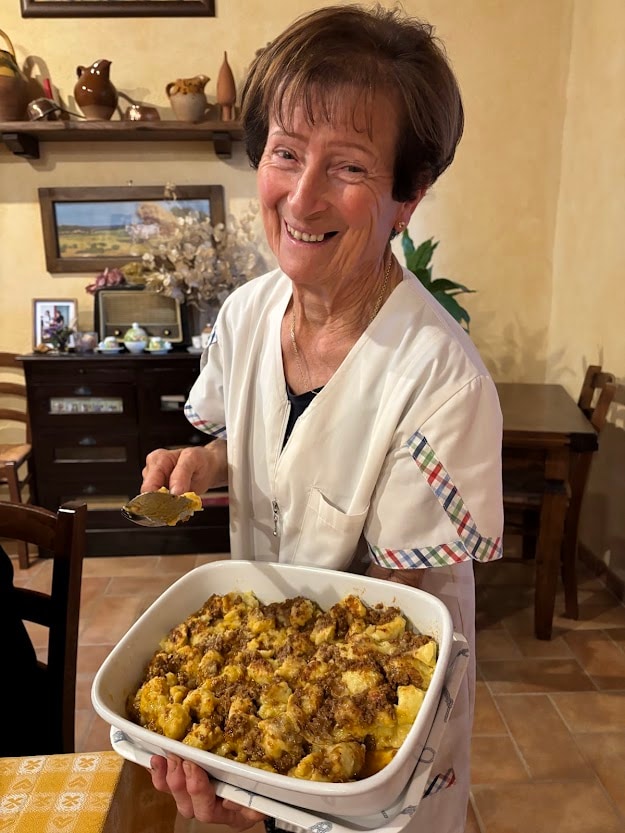 次に出会ったのは、イタリア中部でアグリツーリズモを営むカルラさん。宿に到着すると、80代というのは信じがたい小柄で可愛らしい彼女が、笑顔で元気に挨拶に出てきてくれました。言葉が通じない私たちに、身振り手振りを交えながら、ゆっくりと丁寧に敷地内を案内してくれたのです。