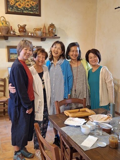 少しずつ傾きを変え、光の注ぎ方を変えていく夕日に照らされながらテラスでお話をしたり、犬と遊んだり、お散歩をしたりとマインドフルな時間を過ごしていると、「ご飯ですよー」と声がかかりました。アンティークな雰囲気の広い食堂に集まると、今日のお客様は私たちと、もう一人の女性。一人旅のその女性は80代半ばで、ボローニャからの長距離を自分で運転をして休暇に来たそうです。日中は海に泳ぎに行ったとか。