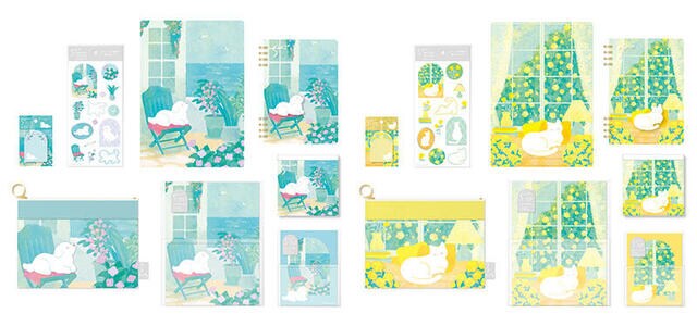 第1弾では、イラストレーター・宮下和さんとコラボレーション。デザインは、海辺の白い街でまどろみながら飼い主の帰りを待つ犬を描いた「海風と犬」と、窓辺の陽だまりの特等席で心地よく目を閉じている猫を描いた「窓辺の猫」、2つの世界観を楽しめる。ラインアップは「下じき」(税込660円)、「ノート」(A6サイズ、同660円)、「メモパッド」(同462円)、「レターセット」(同550円)、「ミニレター」(同495円)、「付箋」(同462円)、「シール」(同275円)、「ポーチ」(同1,980円)の全8アイテム。
