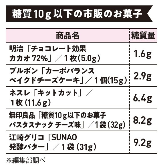 [図表]糖質10g以下の市販のお菓子 出典:『専門医が教える1分で肝臓から脂肪が落ちる食べ方決定版』(KADOKAWA)
