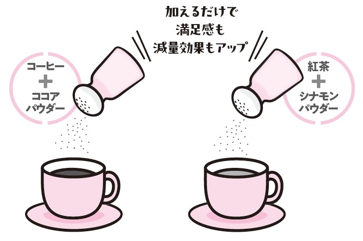 一息つくときに甘いものがほしいこともあるでしょう。そんなときには、コーヒー、紅茶にシナモンやココア(ピュアココア)を加えてみては。糖質の摂取量は増やさずに、シナモンやココアの甘い芳香でスイーツ感がアップします。さらに、どちらも血流を促して代謝を上げるので、ちょい足しにより減量をサポート!