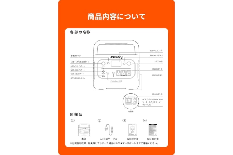 USB 端子、AC コンセント、シガーソケットなど複数の出力ポートを備えており、同時に複数の機器へ給電できます。