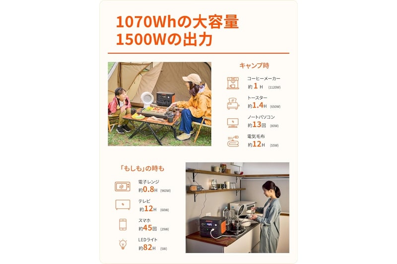 Amazonでみる容量は 1070Wh、定格出力 1500W、瞬間最大出力 3000W とパワフルで、家庭用家電の多くを問題なく稼働させられます。