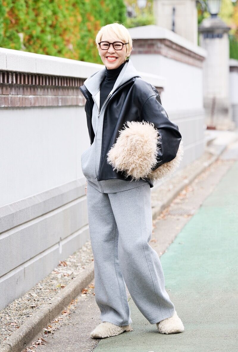 冨永さんはユニクロに初登場したレザー風のジャケットと、ファー小物というテイストの違うアイテムを合わせて。