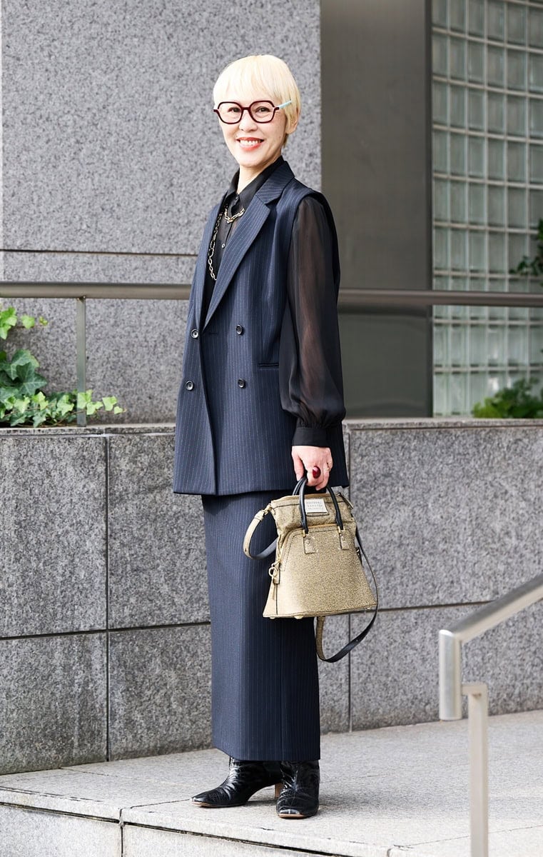 ジレとスカートはネイビー、ブラウスとブーツは黒を選んで、それぞれ色をリンクさせています。