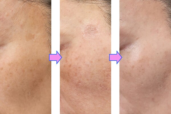 そしてその濃くなったシミは「1週間~1か月(ターンオーバー速度により異なる)かけてかさぶたとなり、やがて自然と剥がれ落ち、シミが薄くなる」経過をたどります。洗顔やスキンケアは通常通り行ってOK。かさぶたを自分で剝がすのはやめましょう。