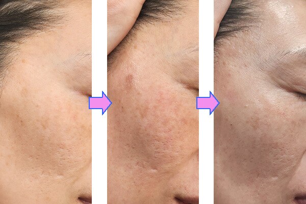 【画像左から:右頬の「照射前」「照射直後」「照射1週間後」】