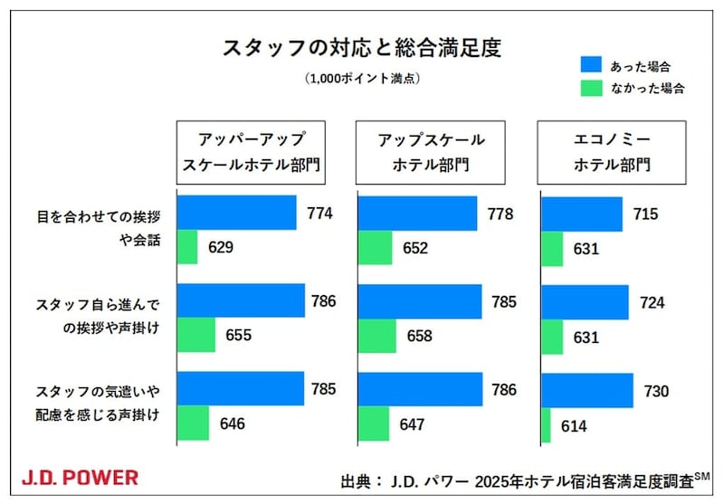 チェックイン時にスタッフから「目を合わせての挨拶や会話」や「スタッフ自ら進んでの挨拶や声掛け」、「スタッフの気遣いや配慮を感じる声掛け」があった場合と、なかった場合を比較すると、いずれの部門でも総合満足度に100ポイント前後の差が見られた。この結果から、自動化が進むエコノミーホテル部門であっても、人的対応の質が満足度に強く影響することが明らかになった。