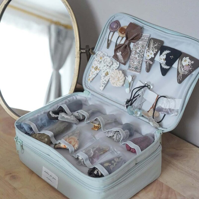 内側は、収納力の高い2段構造。ヘアゴムにシュシュ、ヘアピンなど、様々なアクセサリーが収納しやすい工夫が詰め込まれてます。