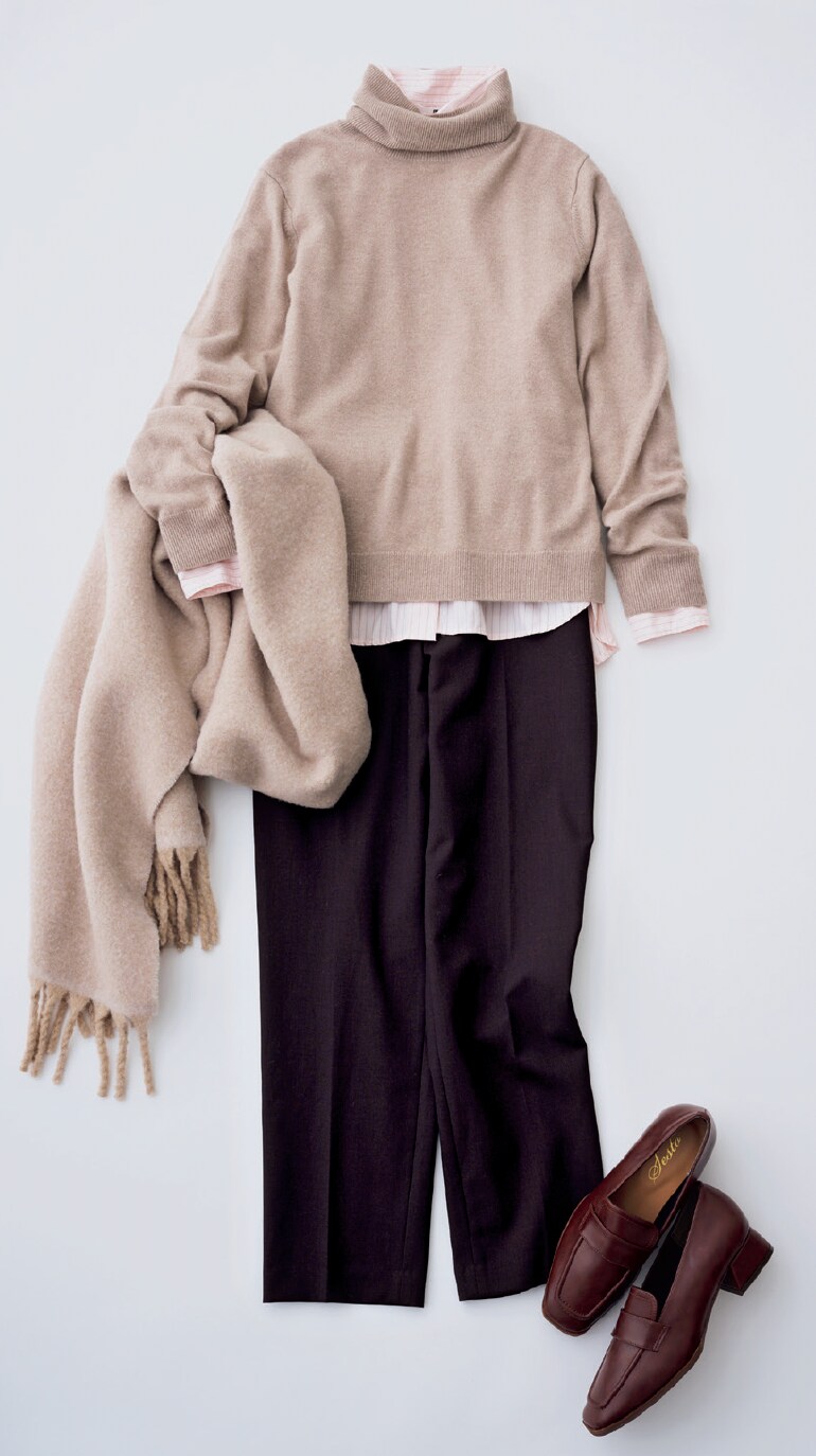 「なにより肌触りにこだわりたいのがタートルネックセーター。ベーシックで上質なものを持っていると、かなり便利です。こちらは身幅にほどよくゆとりがあり、厚み&丈の長さも絶妙。重ね着もしやすく、イン&アウト、どちらにも使える優秀アイテムです。