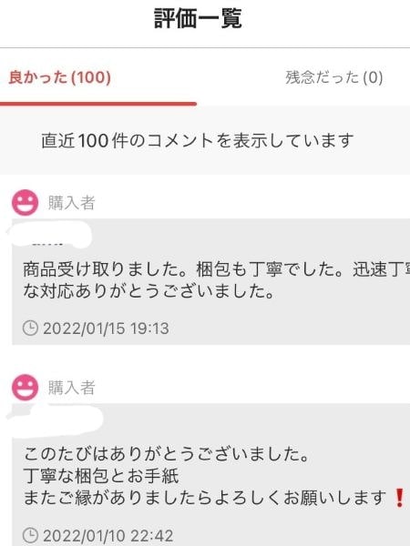 メルカリでは売買取引後に出品者・購入者それぞれの評価を行います。必ず購入前に出品者の評価を文章も含めて確認するようにしましょう。そこでポジティブな評価内容のは誠実に取引をしているという安心材料の一つとなるでしょう。