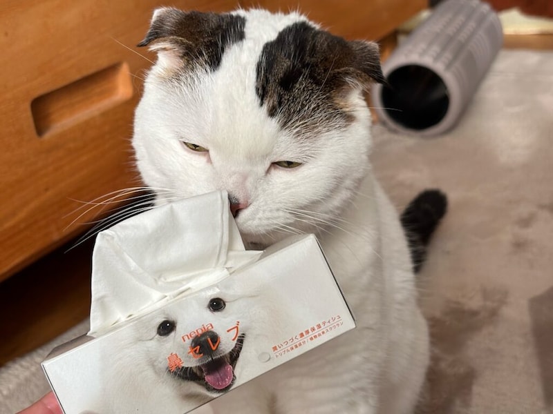 生まれは京都、育ちは大阪の6歳オス。いなほという名前は、飼い主が大好きなスピッツの曲名から。コーヒーこぼしちゃったみたいなアゴの茶色の斑点が、オレのチャームポイント。飼い主さんには、かなり用心深く繊細なタイプと言われてて、インターホンの音が鳴ると雲隠れし、ティッシュを抜く音にさえびっくりして跳び上がってしまうほど。本誌2021年7月号にて、わたなべとしふみさんによるいなほの紹介イラストを掲載しています。