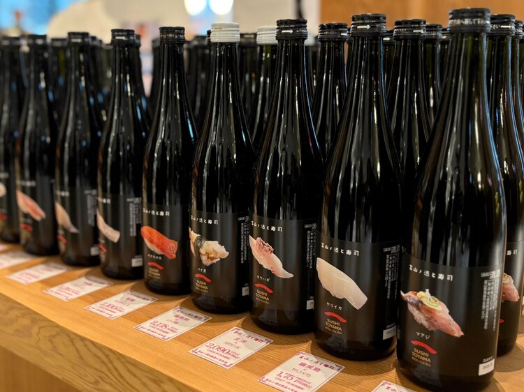 店内で目を引いたのは、寿司ネタに合う日本酒「富山ノ酒と寿司」。ラベルに寿司ネタが描かれ、相性が一目でわかるユニークな一本です。この日は特別に、同シリーズの試飲とます寿司のペアリングを体験。さらに「富山県酒造組合」専務理事の東さん、「富山ます寿し協同組合」理事長の大郷さんから日本酒やます寿司の背景を伺い、富山の食文化の奥深さを改めて実感しました。