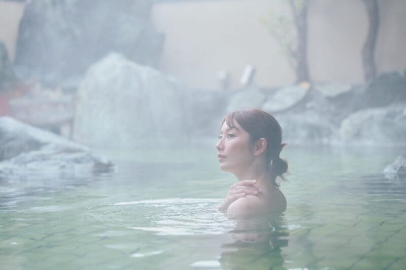 強い冷えがある場合、温泉で急に体を温めると一種のヒートショックのような状態になりやすいので、入浴前に足首やふくらはぎ、腰まわりをカイロなどで入浴直前まで軽く温めておくといいでしょう。ぬるめの白湯を少し飲んで、体を軽く温めるのもおすすめです。