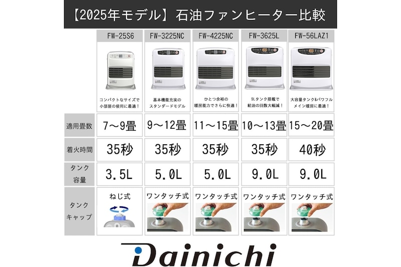 ダイニチの石油ファンヒーター「FW-5625L-W」は、木造15畳まで・コンクリート20畳までを目安に使えるパワフルなLタイプです。