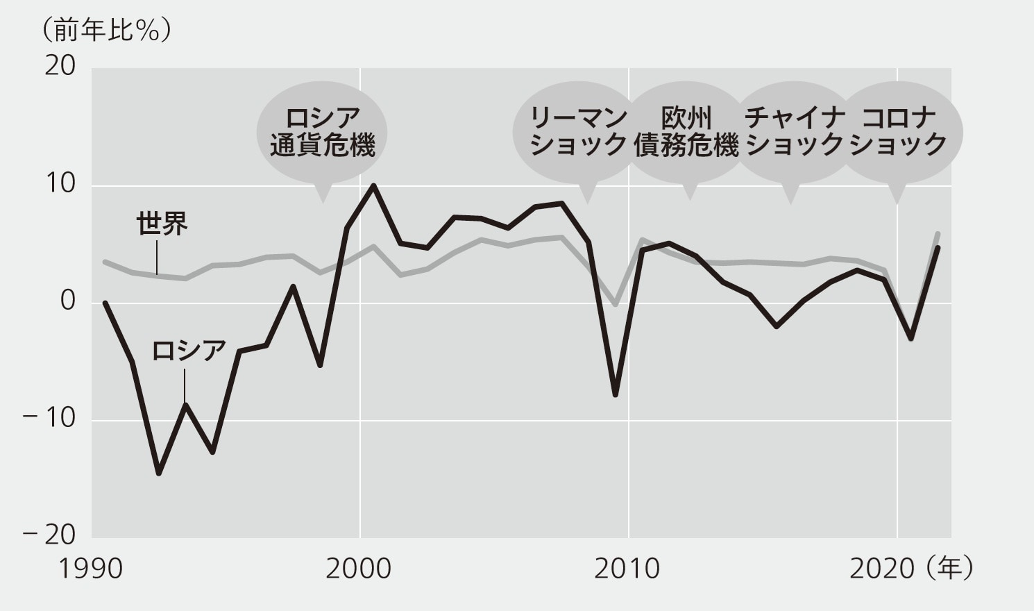 ロシア経済のGDP(国内総生産)は2021年で約1.8兆ドルと、世界第11位です。ソ連崩壊後のロシア経済を見ると、1991年以降の年平均成長率は約1%でした。この間に世界経済は年平均3.3%で成長していましたので、大きく後れをとりました。その主因はソ連が崩壊したことによる経済混乱です。