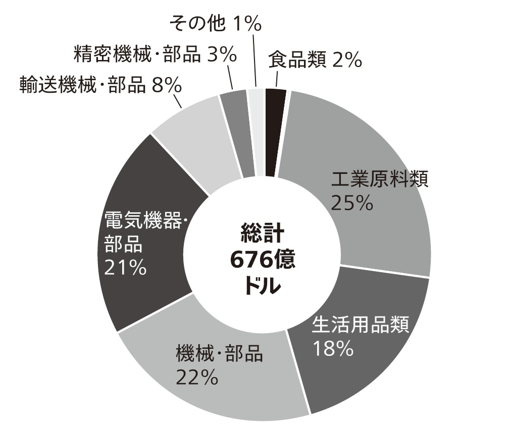 中国がロシアへ輸出している品目を見ると(図表14)、「機械・部品」が22%、「電気機器・部品」が21%、「輸送機械・部品」が8%で、これらを合わせるとおよそ5割です。また、「工業原料類」が25%を占め、また「生活用品類」も18%と多く輸出されています。