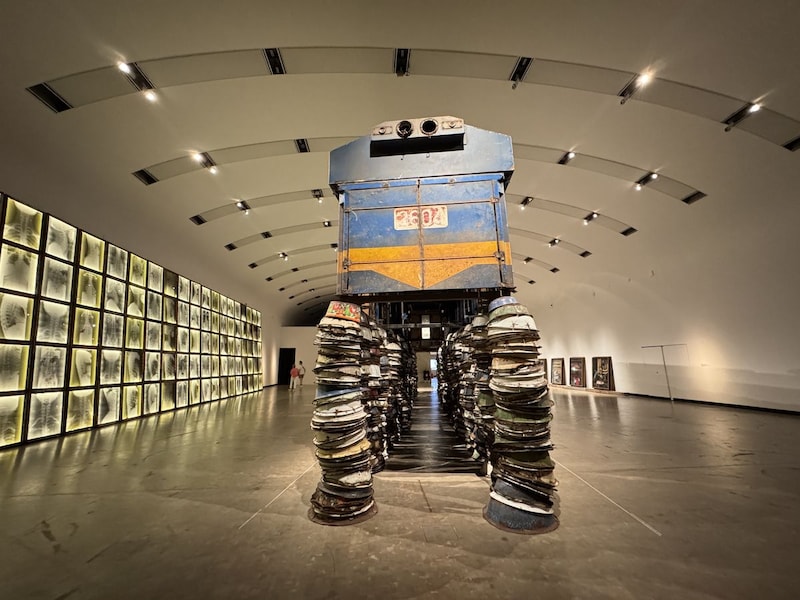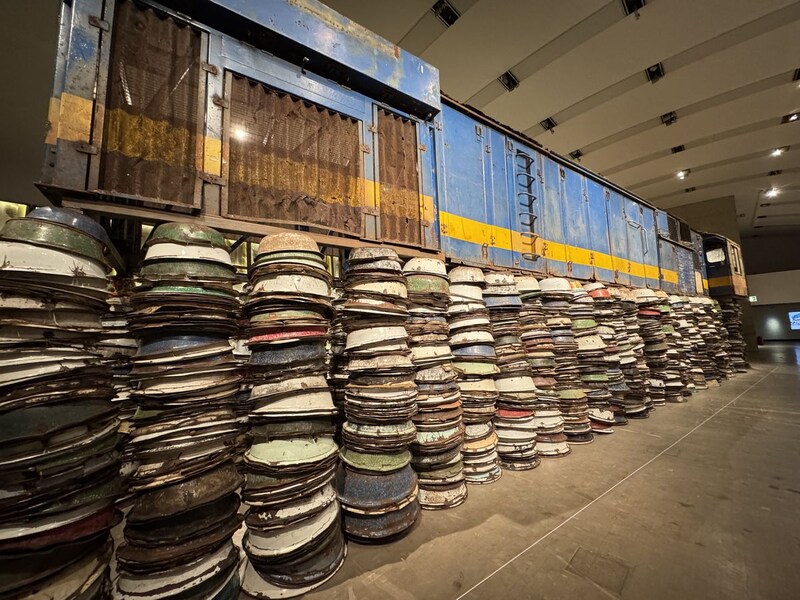 今年ウィーンで開催された個展では、古い列車を使った大型のインスタレーションを展開。マハマはガーナで入手したドイツあるいはイギリス製のディーゼル機関車の車体をいったん解体し、ウィーンに輸送して再度組み上げた。中心作品は、この機関車を何千ものヘッドパン(鉄製の大きなたらい)で積み重ねた「土台」で支えるというもの。ヘッドパンはガーナで物資を運ぶために広く使われる日常的な道具であり、マハマは作品のために新品のヘッドパンと交換しつつ大量の使用済みパンを収集した。列車とヘッドパンという二つの輸送容器を組み合わせることで、輸送・流通システムやガーナの人々の労働を彫刻的に可視化している。