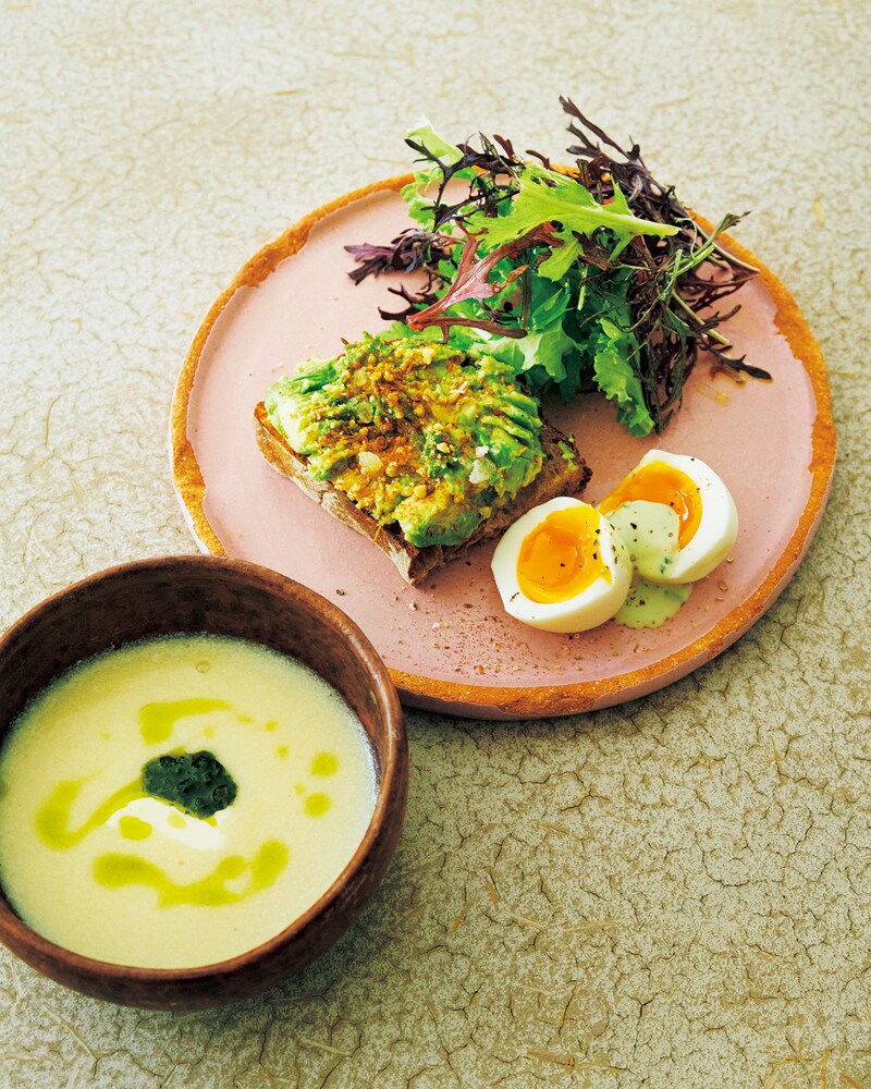 「ふだんからミキサーで野菜のスープやハーブオイルを作っています」と話すのは料理人の野村友里さん。特に季節のスープは、旬の野菜をまるごと使った滋味深いメニュー。 「今回は新玉ねぎを使いました。ミキサーにかける前に、鍋で蒸し煮にして塩麹を入れて、ペーストにしておくのがポイント。水分が残ったままだとスープ量が増えてミキサーから溢れてしまうこともあるので。濃度は豆乳か牛乳を足しながら調整します。野菜はそのとき手に入るものでよくて、なすやとうもろこしでもおいしいですよ」 一方、ハーブオイルはサラダや魚料理に合う万能オイル。 「今日はしそオイルを作りました。大葉に山椒の葉、太白ごま油を入れてミキサーにか …