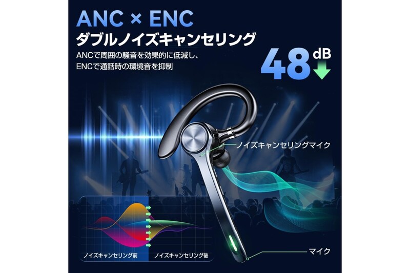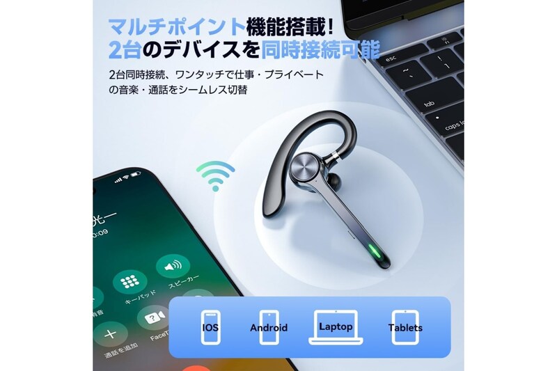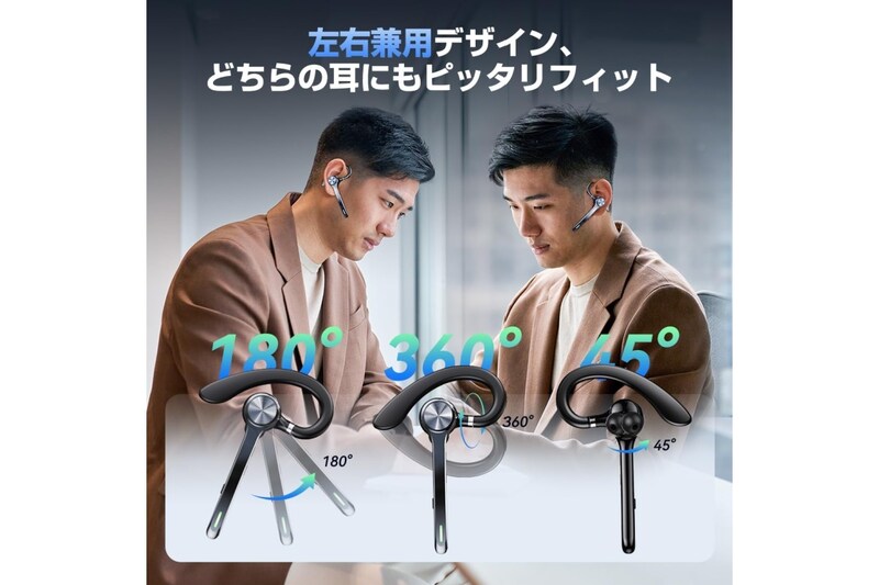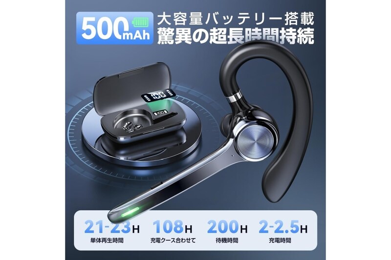 こちらのBluetoothヘッドセットは、片耳タイプで長時間の通話やオンライン会議に使いやすいワイヤレスイヤホンです。