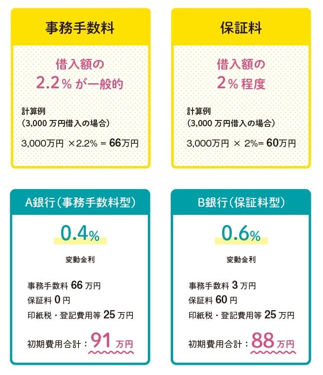 特に重要なのが事務手数料と保証料で、金融機関によって大きな差があります。事務手数料と保証料が両方かかる金融機関はあまりなく、事務手数料を支払うのであれば、保証料は求められません。ただし、いずれにせよ両者は借入時に一括で支払うため、初期費用として準備しておく必要があります。