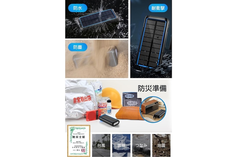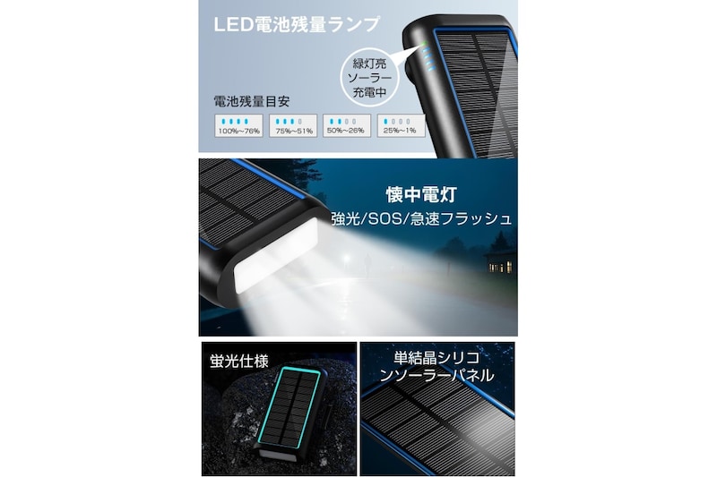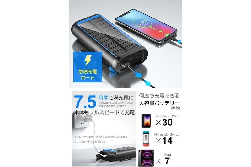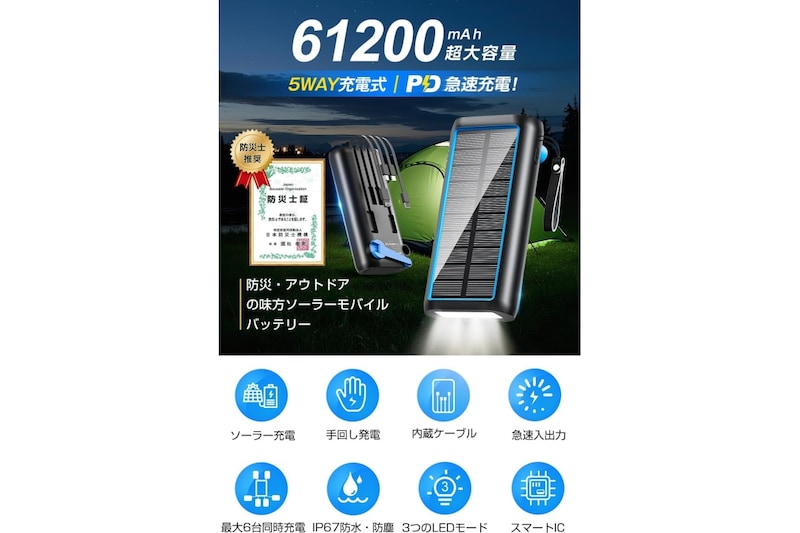 zonzonのソーラーモバイルバッテリーは、61200mAhの大容量で、スマホや小型デバイスの充電切れ対策に心強いモデルです。