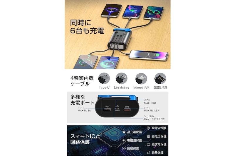 Amazonでみる複数のデバイスをまとめて充電したいときにも使いやすく、家族での共有や非常袋への常備にも向いています。