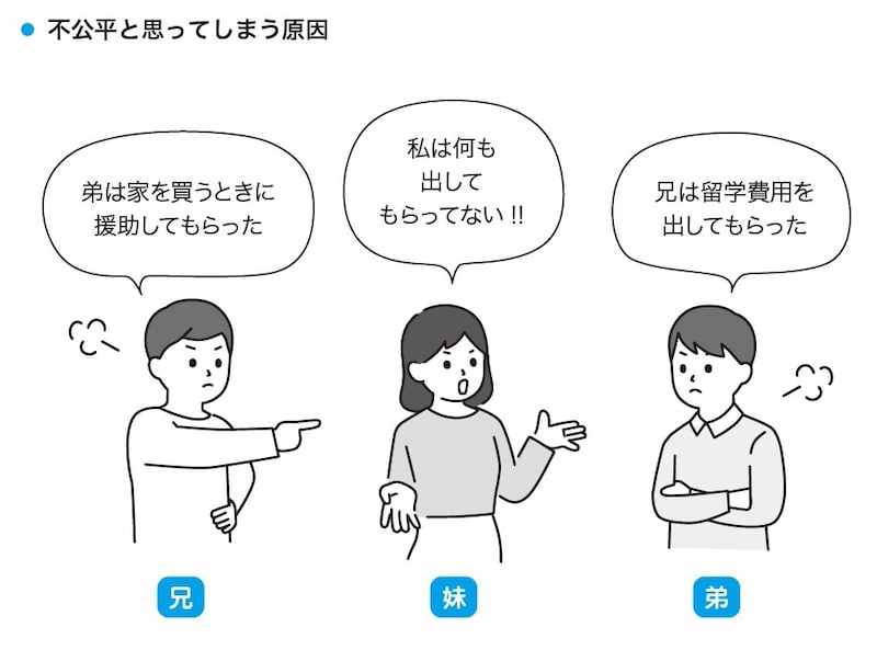 相続の場面でよく起こるのが、「生前にどれだけ支援を受けたか」に対する親族間の認識の違いによる不満です。「兄は留学費用を出してもらった」「妹は私立大学に通わせてもらった」「弟は家を買うときに援助してもらった」などどれも親の厚意として行われた支援のはずですが、いざ相続となると「自分には何もなかった」と不公平感が芽生えることがあります。