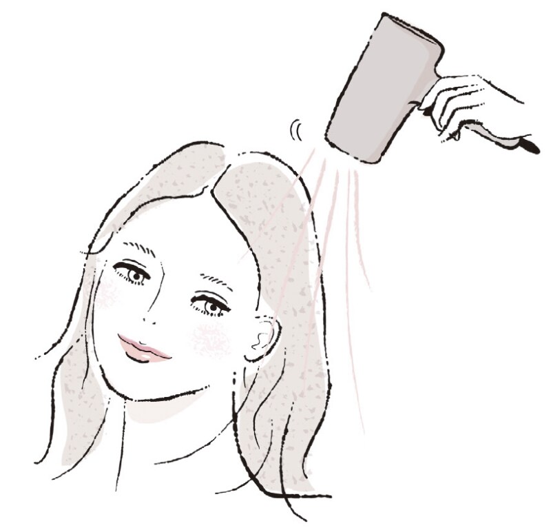 髪表面が乾いてきたら手ぐしで髪を伸ばし、冷風を当てるとまとまりやすくなる。