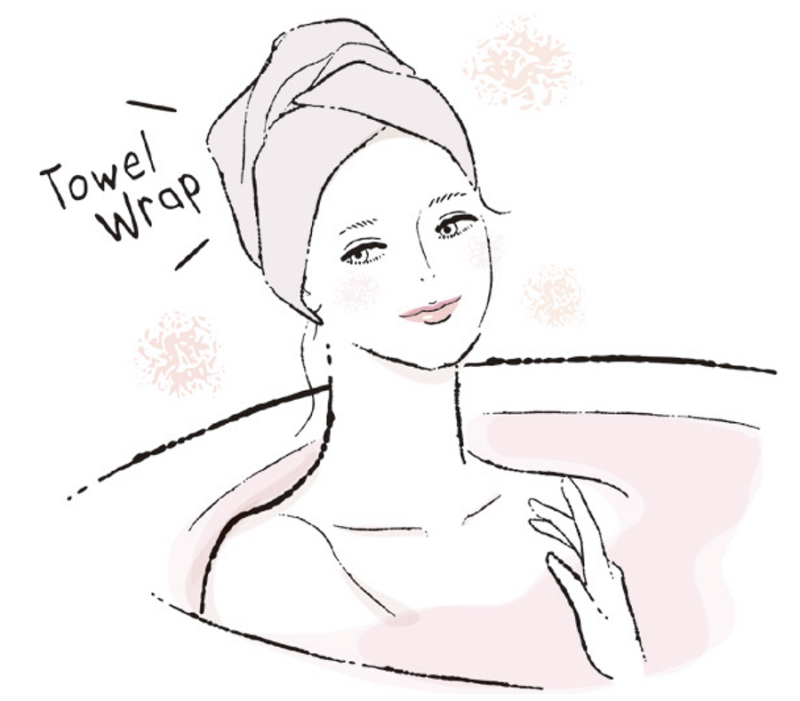 トリートメントの成分を髪にしっかり浸透させるために、7で使ったタオルで頭全体をふんわりと包み、湯舟に浸かって5分以上おく。