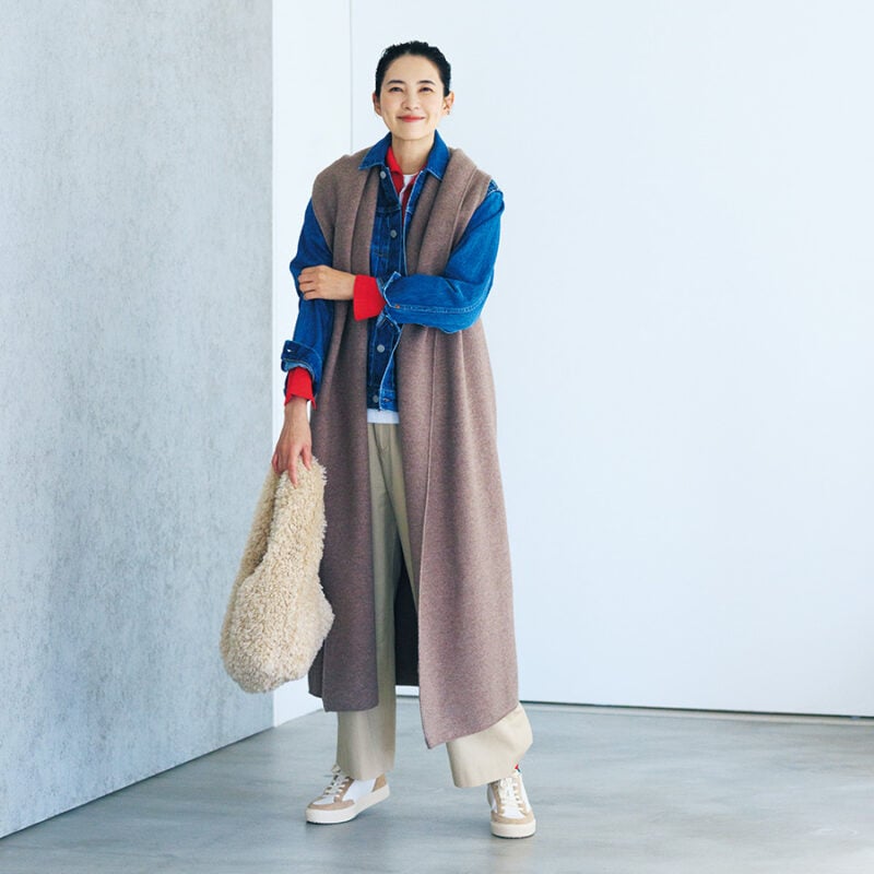 テクニック不要でおしゃれになるのがロングジレとの組み合わせ。インディゴと相性のよいブラウン系ジレを選べば間違いなし。
