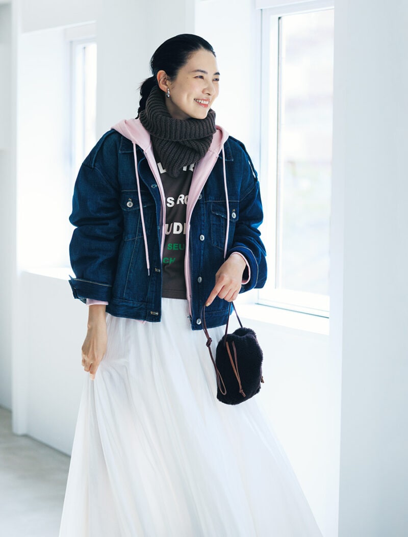 挿し色になる淡色パーカを中に合わせて、優しい雰囲気に