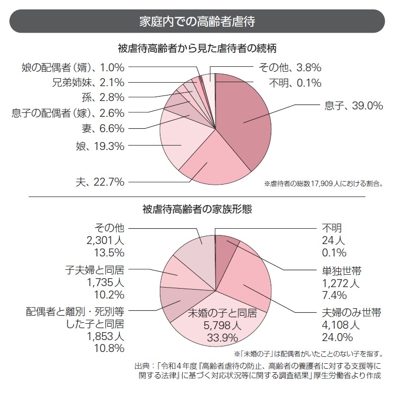 虐待の加害者となるのは「息子」がもっとも多く約4割。また、家族形態を見るとシングルの子との同居(「未婚の子」「配偶者と離婚・死別等した子」)が約半数。「夫婦のみ」を合わせると、7割以上が二人暮らしです。