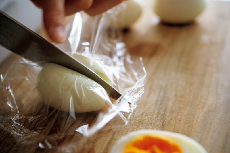 3.鍋に湯を沸かし、沸騰したところに卵を入れて7分40秒茹でる。熱いうちに殻をむき、縦半分に切る。アンチョビも縦半分に切る。