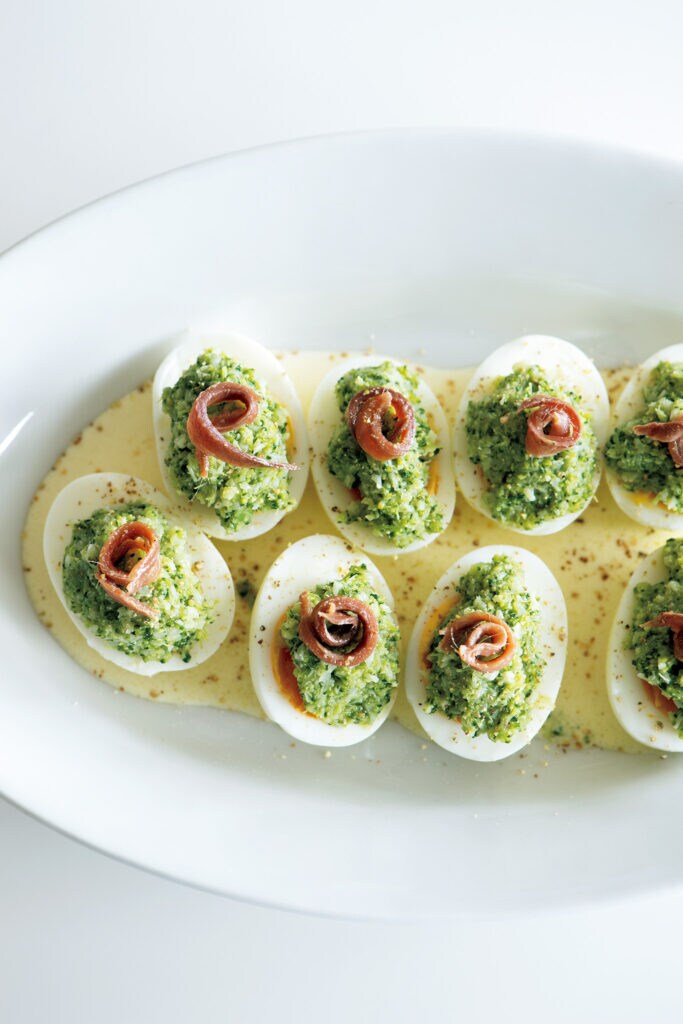 4.皿に2を敷き、ゆで卵を並べ、1とアンチョビをのせ、白胡椒を挽く。