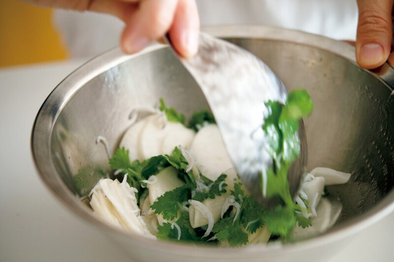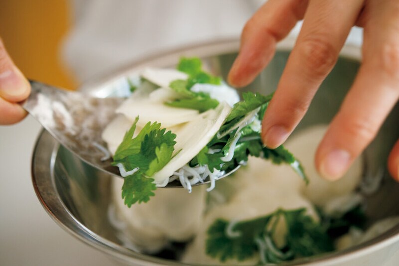 2.1のボウルにパクチーの葉、シラスを加え、レモン汁、太白胡麻油をふり、ざっと和える。