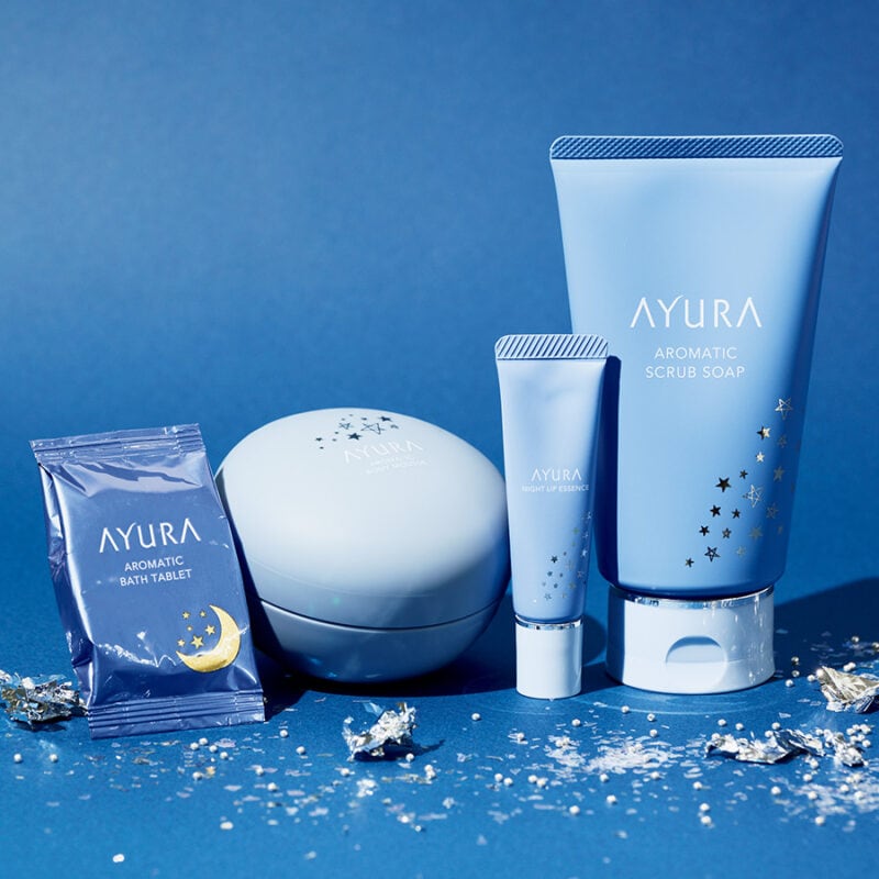 アユーラ アロマティックスクラブソープ 150g、同 アロマティックバスタブレット6錠、同 アロマティックボディムース 120g、同 ナイトリップエッセンス 10g