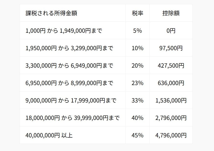 所得税は、以下の表のように、所得額が多くなるほど高い税率が課される累進課税制度が採用されています。そのため、給与所得など、仮想通貨取引以外にも高額な所得を得ている場合は、納付すべき税金が高額に上がる可能性がある点に注意しなければなりません。